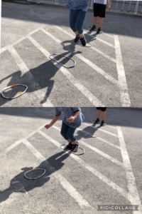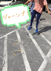 新聞紙で作った輪っかで、片足飛びと両足着地の動きを練習しました~☺