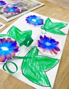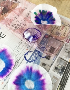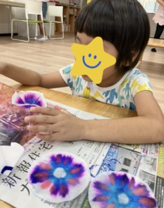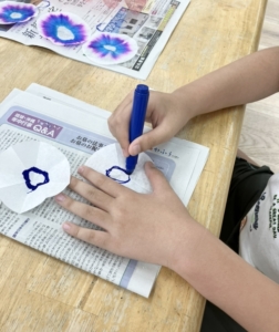 水で染めて色の染み方や色が変わっていく様子をみんなで観察しました🎵