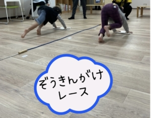 サーキット遊びでは雑巾がけレースやジャンプ、ボール入れ等種目を回って楽しみながら体力づくりを行いました♪